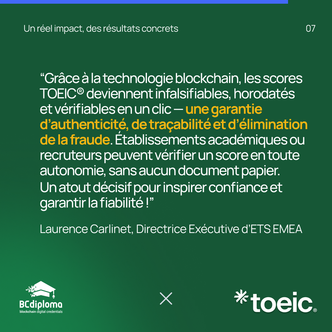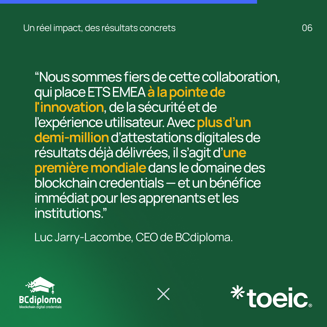 Avec la montée de la digitalisation dans les sphères de l’enseignement et de la formation professionnelle continue, le besoin d’échanger facilement et en toute sécurité les résultats d’un test TOEIC® devient une demande récurrente de nos clients académiques (Universités, écoles d’ingénieurs, grandes écoles, Business school) et organismes de formation ou école de langues.
